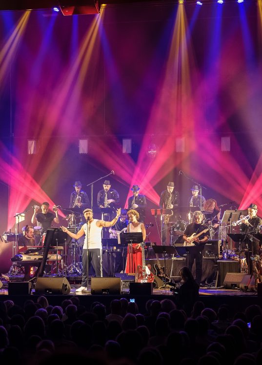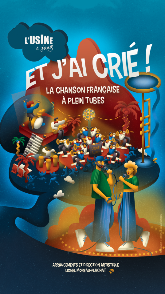 The 18 musicians of the Big Band l’Usine à Jazz and their vocal guests Laëtitia Hulewicz and Samuel Chaffange revisit masterpieces of French song with explosive originality, infectious festive energy, and deep respect. The timeless and popular hits of Piaf, Gainsbourg, Barbara, Brassens, Patricia Kaas, Christophe, Les Rita Mitsouko, Michel Jonasz, Niagara, and Joe Dassin are polished to perfection and transposed into eclectic tempos and musical styles, from swing to electro, Afro-rock, funk, reggae, and mambo, to rediscover a new, vibrant, and contemporary sparkle.